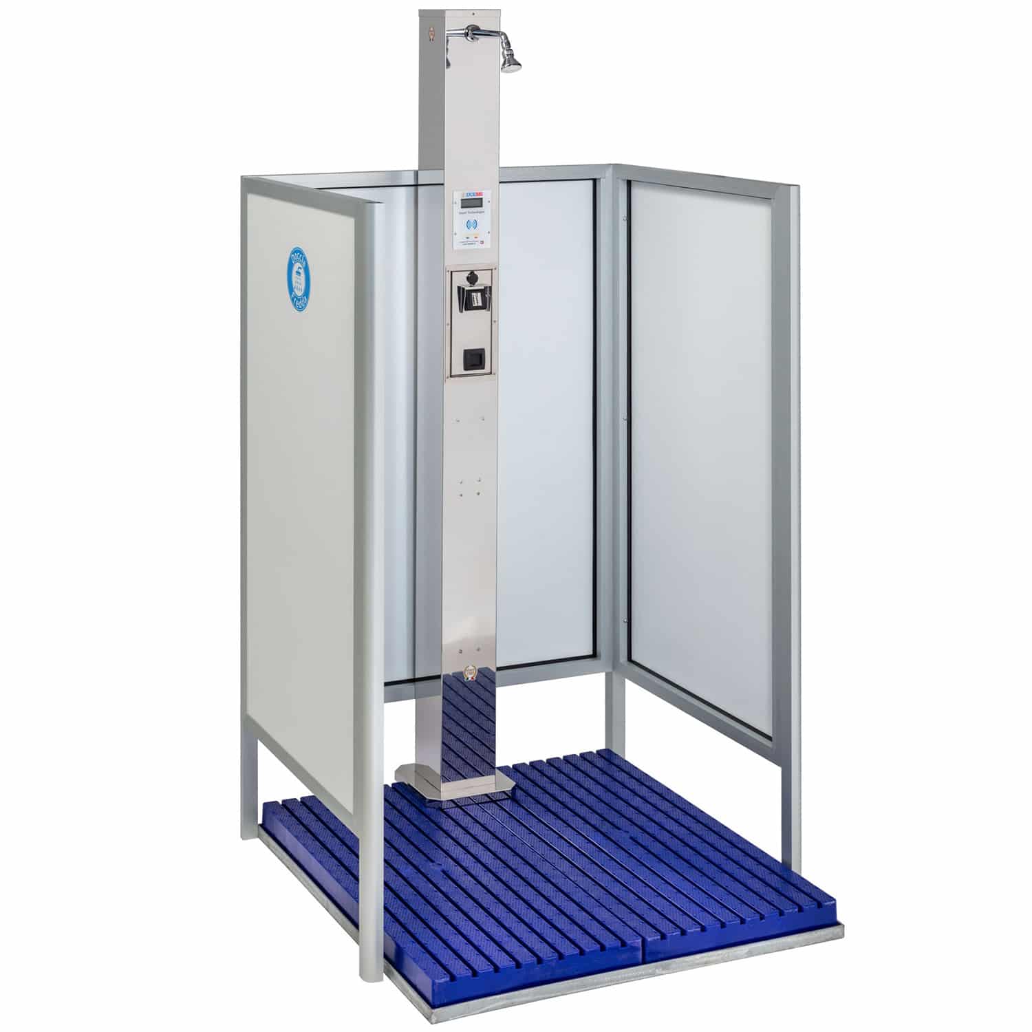 Box in alluminio e HPL, corpo doccia inox AISI 316L, pedana in PVC su acciaio zincato. Variante dei modelli Q Gett con struttura portante zincata, pedana PVC e separé (3 pannelli singola, 4 doppia).
