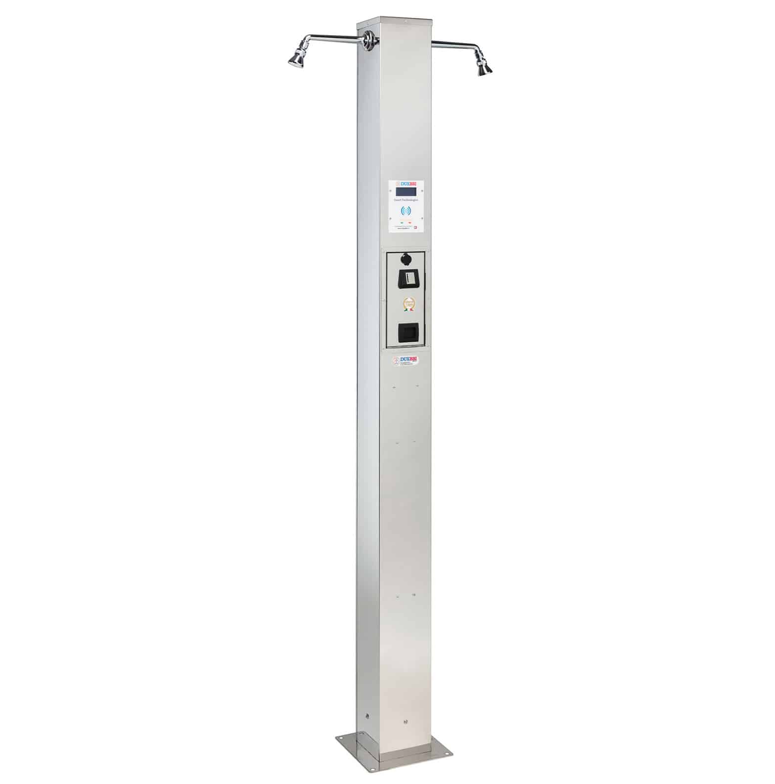 Struttura in acciaio inox AISI 316L da 10/10 mm, finitura mirror. Colonna doccia a 2 posti con gettoniera e S.E. programmabile tramite display ad alta luminosità.